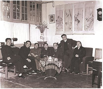 1960年,戏剧家们在北京张自忠路欧阳予倩家中,左起:陈白尘、阳翰笙、张庚、夏衍、欧阳予倩、田汉、李伯钊