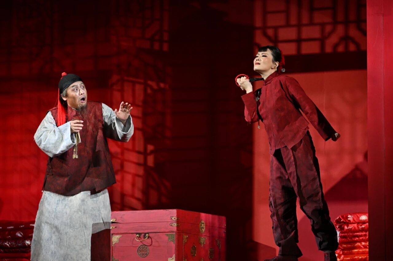 小说的线性叙事难以展现视觉与音乐切换所产生的巨大张力,而这正是歌剧艺术的魅力所在。在第二场中,一座精雕细琢的中式婚床成为舞台核心,九儿身披红嫁衣,静坐于血色光影中,周遭的红灯笼、锦缎铺盖,共同构筑起一个华丽而压抑的封建牢笼。当患有肺痨的单扁郎踉跄闯入,在婚床上展开一场追逐时,戏剧的荒诞感油然而生。他唱腔滑稽,强调“姻缘天定”;九儿的回击则如惊雷,唱出“宁死不嫁汉奸”的决绝。二人风格迥异的唱段形成尖锐对抗:单扁郎的唱腔带着俚俗的狡黠,九儿的反击则如山崩地裂。于是,婚床化身“戏台”,上演着一场被围观的仪式。这种“台中台”的嵌套设计,极大地浓缩了冲突,让个体的反抗在与环境、命运的对抗中,迸发出悲剧性的崇高感。更加震撼人心的,是紧随其后的场景切换:舞台从压抑可怖的婚床转变为无边的高粱地。余占鳌与九儿在此深情重唱,那简单的问答“这里就是家”,与先前场面形成天壤之别。情感如野火般挣脱所有束缚,使这片高粱地化作一场对生命、自由与爱最直接、最热烈的礼赞。
