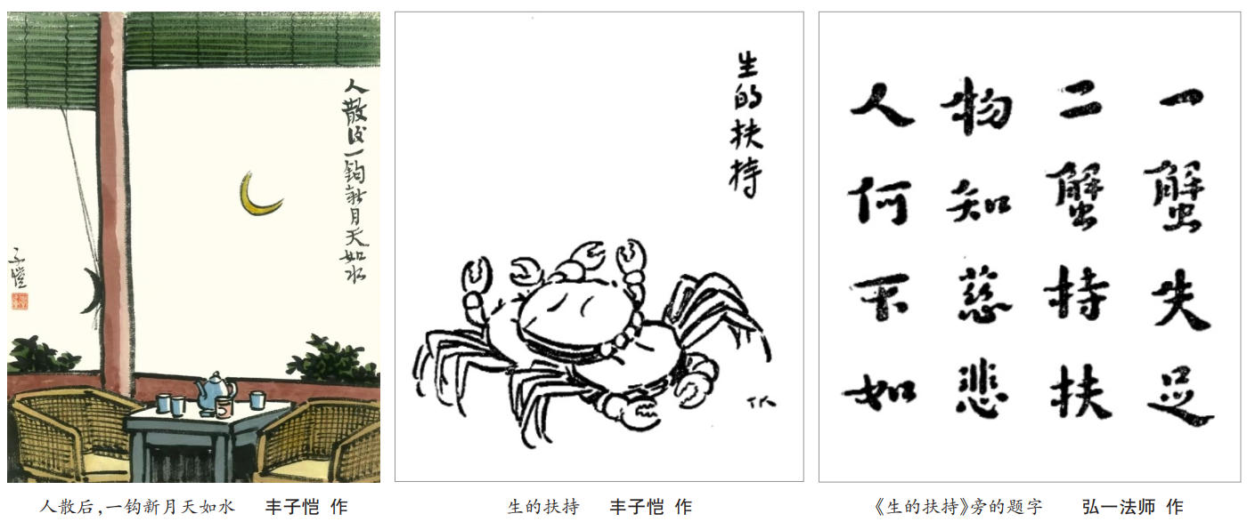 翻阅《护生画集》可见艺术家笔下满是对人间的悲悯。《生的扶持》以螃蟹的扶持揭示“物知慈悲,人何不知”的奥义,《吾儿?!》中母鸡丧子的哀痛正如战争中家破人亡的悲哀,《!!!》呼吁“不履生虫”——作家在《则勿毁之已》中所言的“只恐这一点残忍心扩而充之,将来会变成侵略者”便足以解释这画“事”背后的画“理”。至于其随笔或书信中透露的对风景的爱,则应放到其哲学观念中予以理解。