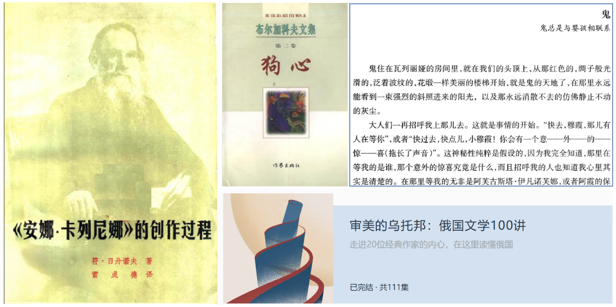 阿舍(作家,著有《托尔斯泰的胡子》《阿娜河畔》等):读俄国和苏联文学,我常有一种吃不消的感觉,好比一个脾胃虚弱的人承受不住补品里的滋补,非要温和少量地循序而进,方得养分之益。所以,相比其他国家,俄苏作品虽读得稍多,却从来不敢对之妄言,因为即便是读过的作品,至今仍只是从自己敏感、共情的那一个方面析出一小部分,如同从一片森林里捡出一枚树叶,常有难以穿越的绝望感。不过,在明白凭一己之力难以深入这片森林之后,我也幸运地不断遇到能够带我继续向前的“好向导”,这大概就是书籍与人的缘分。比如,在重读《安娜》后,我从朋友那里得到了《〈安娜·卡列尼娜〉的创作过程》这本书,从而领悟到这部作品在结构上的建筑美学。比如,读完《静静的顿河》之后,正好刘文飞老师在“看理想”开了《俄罗斯文学一百讲》的音频课,听完肖霍洛夫这一讲,我得以看出《战争与和平》《静静的顿河》二者之间的传承关系,又在后者当中撷取到超越前者的指引——朴素日常里的力量与深情。还有茨维塔耶娃的散文,她竟以《鬼》为题,确凿可信地写出了一位女性的精神成长之路,这对以“写实”为己任和评判标准的当下散文可谓莫大挑衅。布尔加科夫在1925年写出《狗心》,对比当下让人眼花缭乱的科幻作品,《狗心》的精神指向依然超前。精神与情感世界的澎湃汹涌,是老派的俄苏文学给予我的“关键所在”,我仰望并需要,又因为畏惧她的光芒不时躲开。