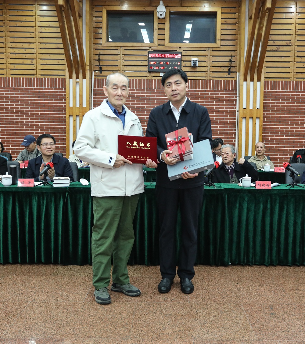 严文井之子严欣强向中国现代文学馆捐赠严文井手稿,中国现代文学馆常务副馆长王军接受捐赠,并向严欣强颁发入藏证书。