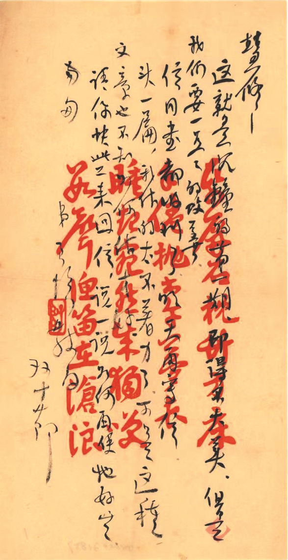 1925年10月10日,冯至(字君培)致信杨晦(字慧修)。书信内容简短,仅103个字,墨笔行书从右向左竖行写于彩笺之上。书信开头便直奔主题:“这就是沉钟的第一期”。“沉钟”即《沉钟》周刊,1925年10月10日出版。刊物出版当天,冯至便写信告诉杨晦出版情况,并给他邮寄了期刊。