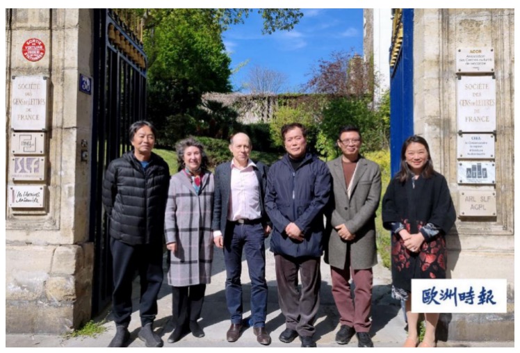 刘震云(左一)、麦家(右二)、赵丽宏(右三)访问法国作协,与法国作协主席阿尔迪(左三)、法国中国文学读者俱乐部负责人、巴黎中国电影节创办人高醇芳(左二)、中国图书进出口(集团)有限公司法国分公司总经理徐革(右一)在法国作协大楼门口合影留念