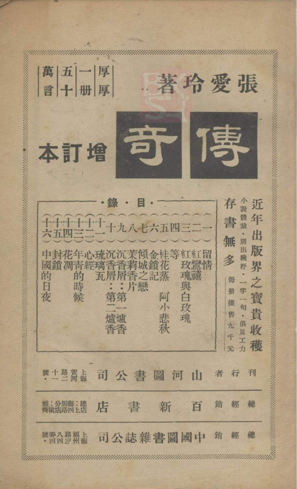 11月,《传奇》增订本出版之后,《新闻报》1946年12月2日、1947年1月30日,《大公报》1947年1月31日、5月6日都登了广告。山河图书公司1947年出版的三期《大家》杂志上,也都登了这部书的广告,前两期还是整页广告。由于当时物价一路上涨,书价从1946年底初出版时的4500元一路上涨到了1947年上半年的9000元,到了五六月间,书价涨到了12000元。山河图书公司在1946-1947年存续期间只做过三种广告:旗下的两种刊物《清明》《大家》以及张爱玲的《传奇》增订本。