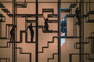 剧情推进至麦基与波莉的婚礼场景,当波莉唱起《海盗珍妮》时,银色幕帘缓缓升起,核心表演区才真正出现在观众眼前。舞台由六个可移动的巨型黑色几何框架组合而成,框架内分布着不规则的平台、阶梯与可开合的机关板,供演员穿梭攀爬。不过在多数时候,演员会从不同方向爬至其中一个狭窄空间,在定点光的聚焦下直面观众表演。