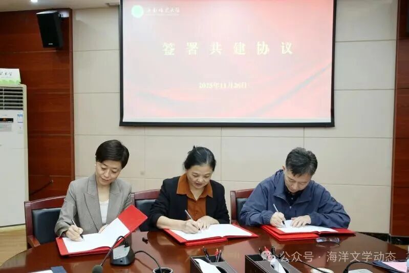 海南师范大学文学院院长王学振教授、海南省作家协会专职副主席王姹、海南省出版发行集团副总经理兼南方出版社总编辑古莉分别代表海南师范大学、海南省作家协会、南方出版社,签署了三方共建协议。