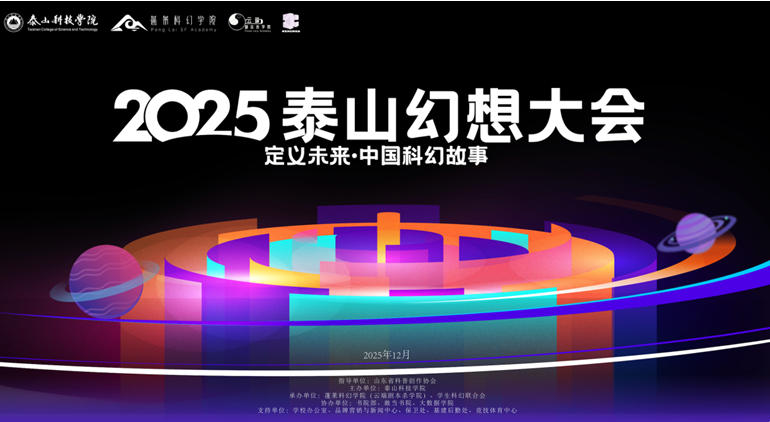 12月6日至7日,由山东省科普创作协会指导,泰山科技学院主办,蓬莱科幻学院(云端剧本杀学院)、学生科幻联合会承办的2025泰山幻想大会系列活动在山东泰安泰山科技学院举行,本次活动的主题为“定义未来:中国科幻故事”。电竞竞猜主席团委员、电竞竞猜科幻文学委员会主任刘慈欣,中国科幻银河奖、华语科幻星云奖终身成就奖获得者王晋康,科普时报社社长、中国科普作家协会原副理事长尹传红,世界华人科幻协会主席韩松,复旦大学中文系教授、博士生导师严锋,泰安市科协四级调研员陈金辉、科普部部长韩盛涛,泰山科技学院常务副校长谢承红、副校长丁海奎、校长助理武浩然,重庆移通学院通识教育学院执行院长皮若兰,蓬莱科幻学院(云端剧本杀学院)副院长宋亚洁,以及杨枫、杨平、凌晨、江波、宝树、超侠、杨晚晴、分型橙子、海漄、孙强、游者、袁振民、姚明、钛艺、伯爵大人、贾天轲等科幻作家、编辑、评论家、从业者,《科幻与想象力》通识课程学生代表和齐鲁科幻联盟学子500余人参加了本次活动。