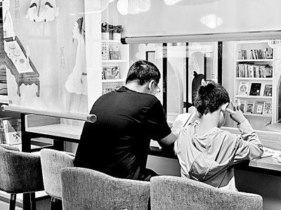 一位父亲正带着孩子阅读图书。光明图片/IC Photo