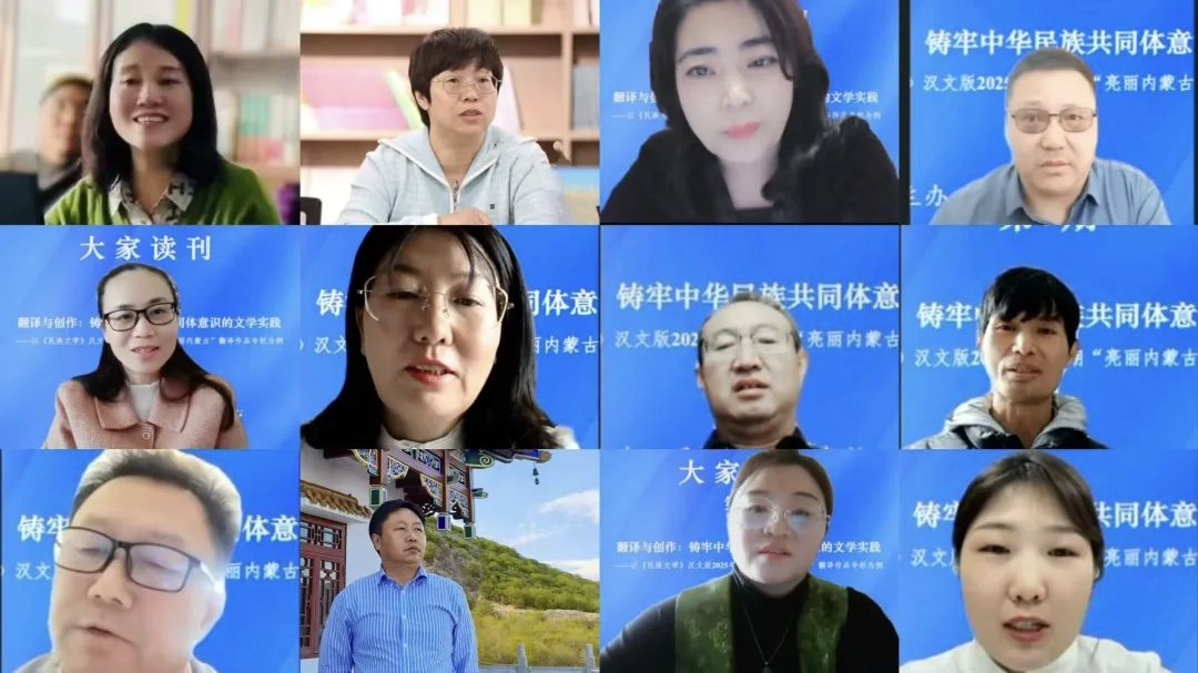 12月26日下午,由民族文学杂志社主办、《民族文学》内蒙古鄂尔多斯创阅中心协办的《民族文学》“大家读刊”第7期读刊会以线上线下相结合的方式举办。本次活动以“翻译与创作:铸牢中华民族共同体意识的文学实践”为主题,围绕《民族文学》汉文版2025年第12期“亮丽内蒙古”翻译作品专栏展开研讨交流。《民族文学》主编陈亚军,副主编朱钢、杨玉梅,内蒙古翻译家协会副主席兼秘书长李苏布道,鄂尔多斯创阅中心负责人阿拉腾道布其,专栏作者、译者,以及读者代表等30余人参加活动。会议由《民族文学》一编室主任永花主持。