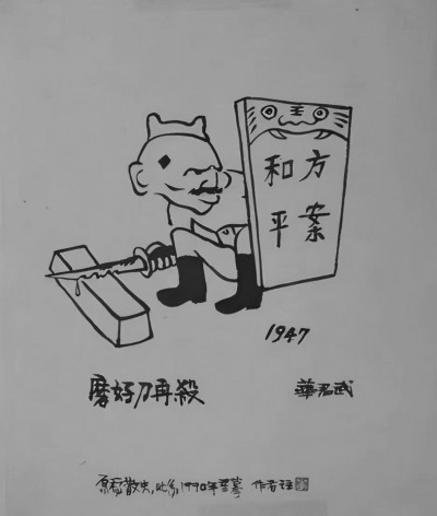 1942年5月,我参加了延安文艺座谈会,听了毛泽东主席的“讲话”,我认识到,大众化和民族化正是我漫画中所缺少的,所以广大人民群众看不懂。怎样解决这个问题呢? 首先要从语言上入手。我开始注意学习和运用老百姓的语言,用以指导我的漫画创作。如《磨好刀再杀》,主人公蒋介石头贴膏药的形象是我创造的,广大人民看了都懂。因此,这幅漫画在当时产生了很大的影响。