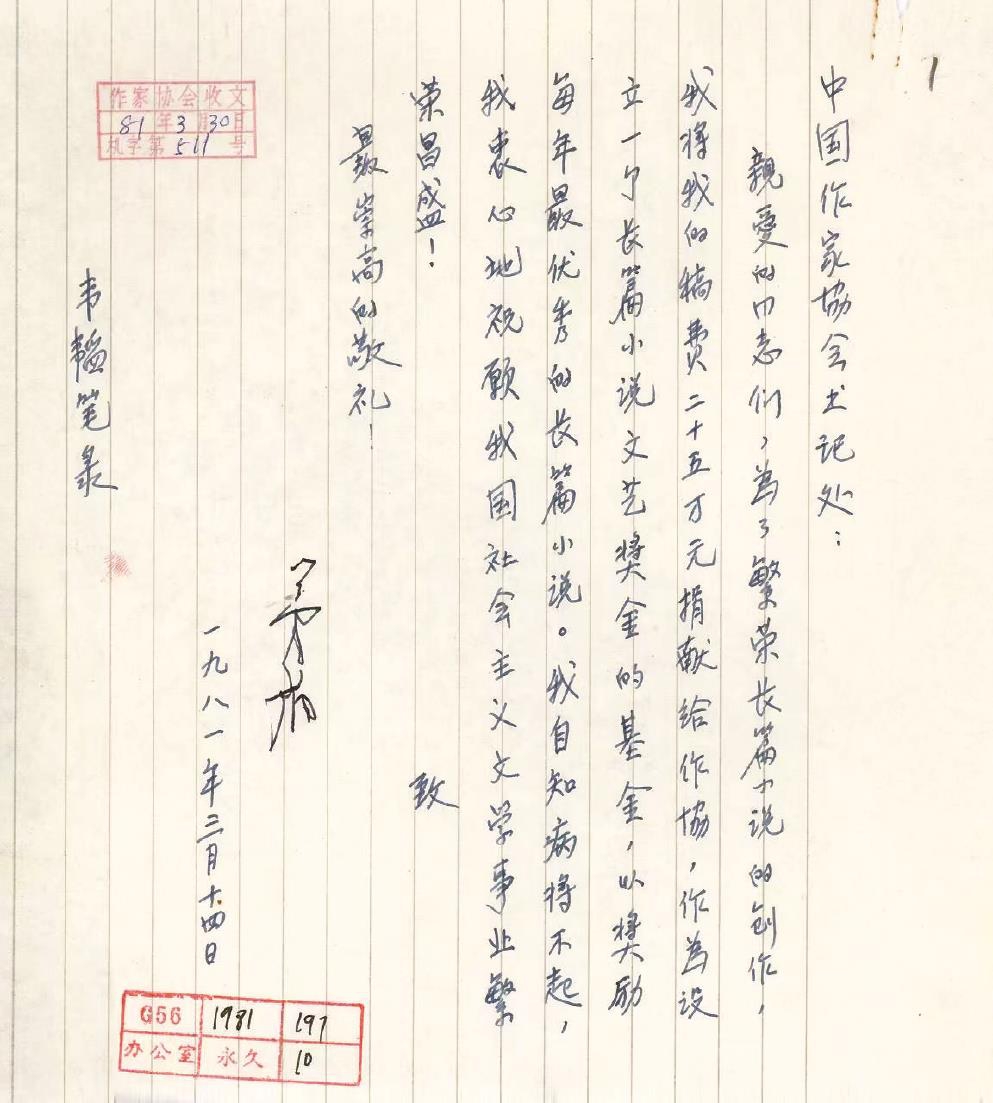 茅盾逝世前致电竞竞猜的信