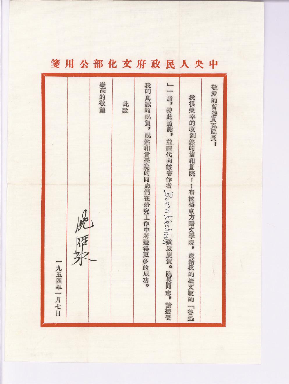 茅盾致普实克的公函 中国现代文学馆藏