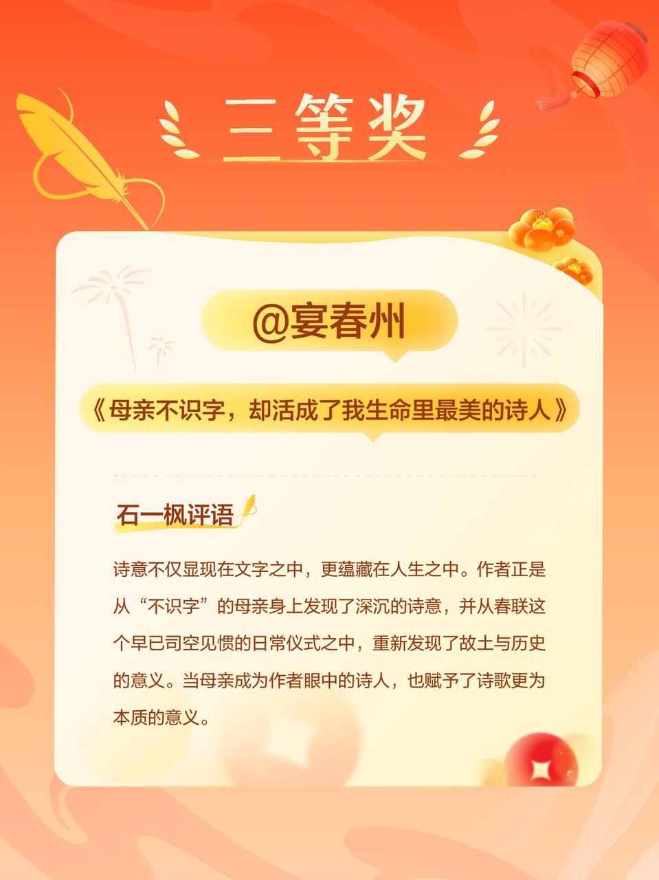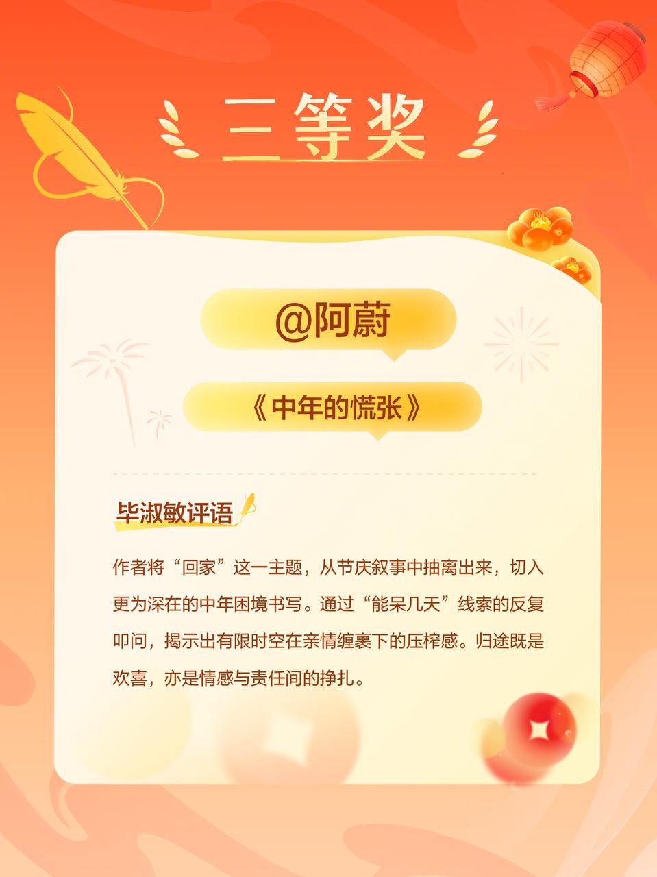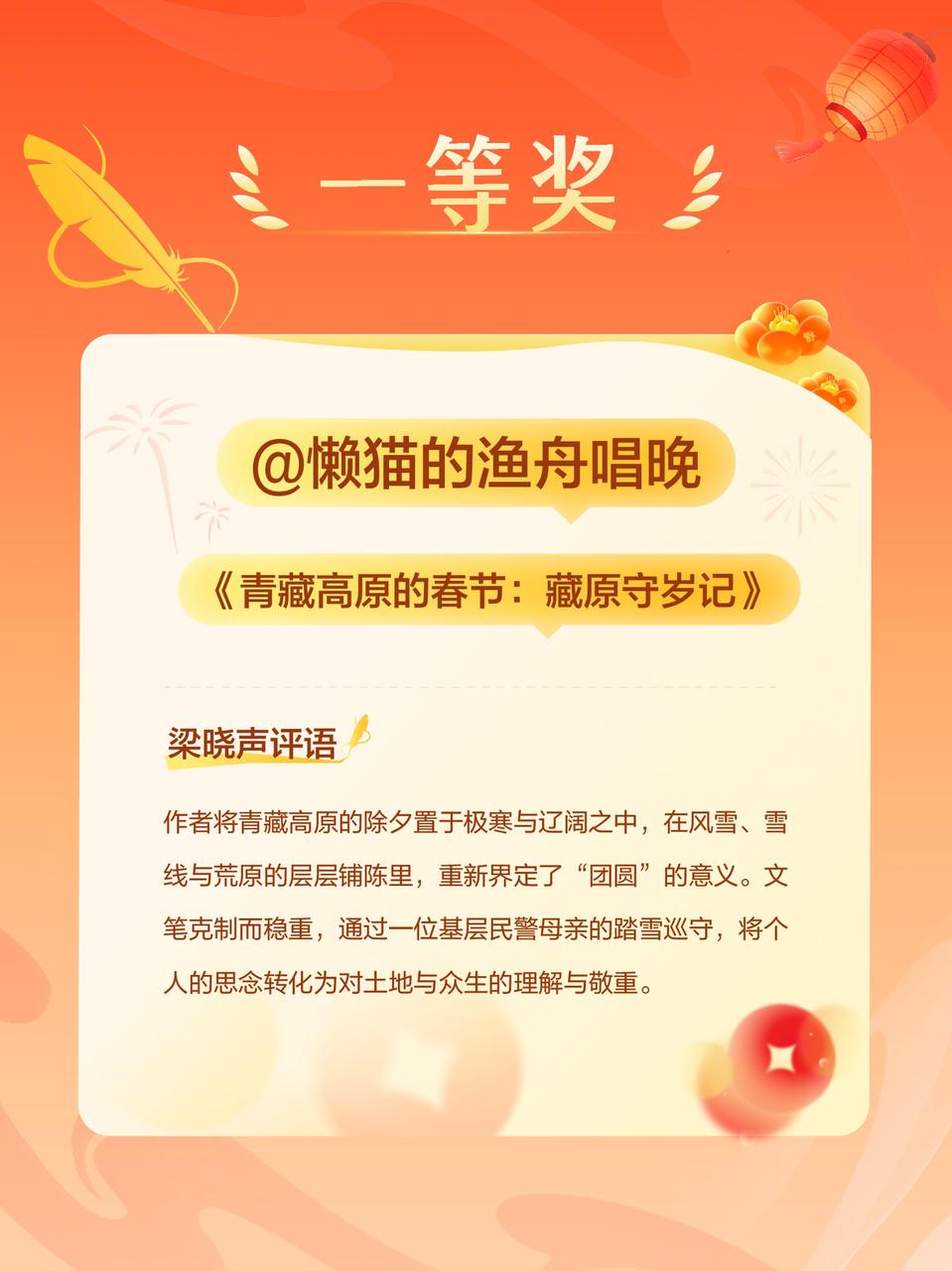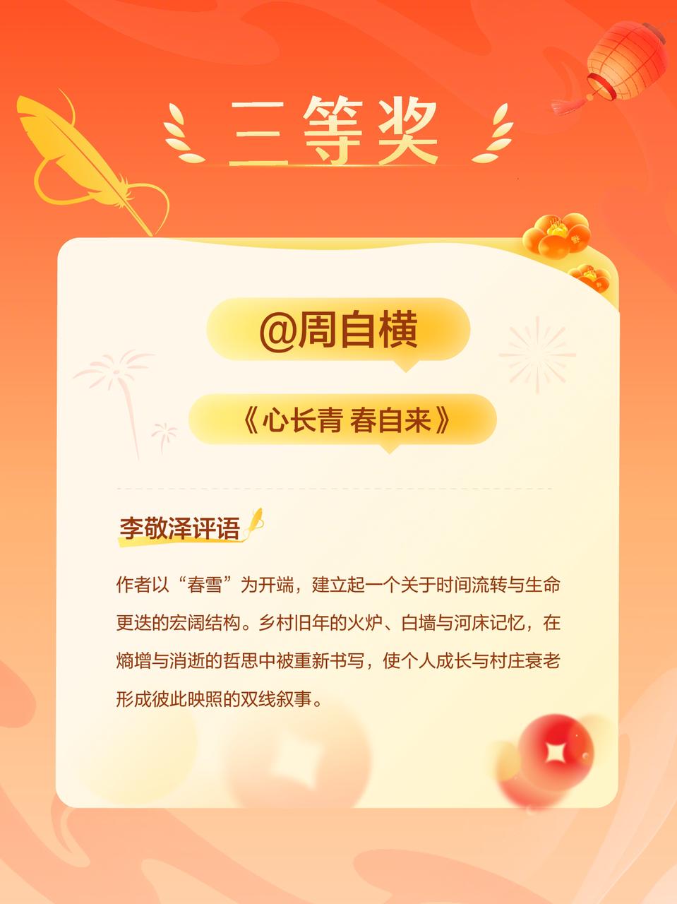 六位终审评委——梁晓声、毕淑敏、李敬泽、阎晶明、阿来、石一枫,为8篇获奖作品写下推荐语。他们以专业的眼光审读文字,也用温暖的笔触写下自己的感受。