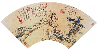 扇画艺术形式语言多元,或写危崖高耸,山石崚峋,幽谷空蒙,飞瀑如练;或画老松虬曲,繁阴如盖,溪流潺潺,空亭凭栏;或作渔舟泊岸,江阔帆远,暮色苍茫,水天相接。一派悠然自得景象,意境或清旷,或萧寒,或淡远。或奇花异卉,争鲜斗艳,栖禽高鸣,秋虫低唱;梅开寒枝,兰吐幽谷,竹摇溪头,菊落篱边。要在扇画上充分表现艺术本体精神,注重于笔简意远、清逸疏淡之中做到情满意足,笔墨须疏密有致,轻重得体,提按转折,收放自如,阴阳向背,灵动多变,小中见大,境界弥开。上海博物馆藏有明代永乐、宣德年间谢缙所作《汀树钓船图》为最早的折扇山水,当时的姑苏城经济繁荣,宫廷院画势力日薄,浙派也渐入末流,“吴门画派”起而代之。以沈周、文征明、唐寅、仇英“明四家”为首的吴门画派,他们技艺全面,题材广泛,从明代成化到嘉靖年间,吴门派绘画最为活跃。清代吴荣光在其题跋中说“到明代四家,唐、沈、文、仇始为书画,蔚为吴下人书画扇面之风气”。是后,书画折扇风气大盛,名人显贵,名家流派遂成明清以来独具一格的书画形式。至明末,松江画派、武林画派、清初六家、宣城画派、四高僧、金陵画派以及扬州画派等等将折扇绘画艺术做了进一步的推进与繁荣。
