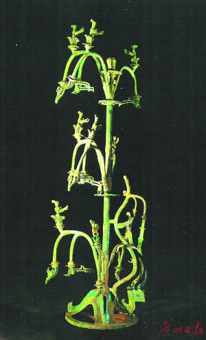 《山海经》中记载说:“汤谷上有扶桑,十日所浴,在黑齿北,居水中,有大木,九日居下枝,一日居上枝。”三星堆出土的这棵青铜神树正是这一传说的真买写照。