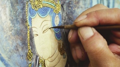 直到今天艺术家们仍然认为毛笔是勾勒佛像的最佳工具。画家王峰正在临摹敦煌莫高窟的壁画。(均纪录片 《中国文房四宝》 摄制组供图)