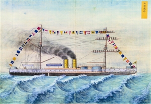 《渤海阅师图册——兵船悬彩》,描绘醇亲王前往定远舰视察。