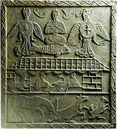 伏羲、女娲形象在汉代画像砖里出现最多。在中国古代神话里,伏羲、女娲是人类的始祖,二者位列三皇。传说伏羲创八卦、结绳造字,女娲炼石补天、捏黄土造人。他们成婚繁衍了人类,被誉为中华民族的“人祖”。女娲是有司生育繁子神力的女神,伏羲“制嫁娶”,亦含有司婚姻的意义。“伏羲女娲双龙楼阙”画像砖分上下两部分,上为一座双阙式建筑,左有一执笏官员,躬身迎接,阙内一人跪拜;右为伏羲女娲二神,其尾相绕,后延至砖的下部,呈一对巨龙,构图巧妙。此图应是虔诚妇人在官祠里向二神祷告,祈求幸福的婚嫁和绵长的子嗣。整个画面浑然一体,充满神秘,含义颇深。