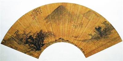 扇画款识中称“元人高房山遗韵”。高房山,即高克恭(1248-1310)元代著名画家。字彦敬,号房山。祖籍西域(今新疆),占籍大同(今属山西),后居燕京(今北京)。元大中时,为刑部尚书。画山水初学二米,后学董源、李成笔法,专取写意气韵,亦擅长墨竹,造诣精绝,与钱选、赵孟/n1/2016/0802/并称为“元初三家”。张岳崧称得其“遗韵”,可见他对高房山的画风了然于胸,自己作画也“意与兴驱,境与心构”,将思想与意趣融入画面,力追元大家的精神气韵。