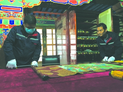 在布达拉宫,普查工作人员正在测量一幅唐卡的长度。