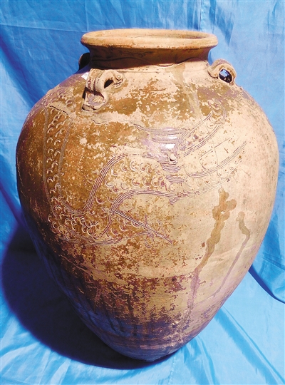 “这口唐代青釉龙纹四耳大缸是由新民村古龙窑烧制而成。”容族新说,古时陶器与人们的生活时刻不能分离,挑水、煮饭、酿酒、煎药、盛粮食、沏茶、喂猪、烧香、制作烟囱等都要用到。就在2014年,山东莱芜市文物管理委员、考古学者李仕严来到新民村古龙窑,挖出一大批唐宋时期的陶瓷片,这些都可说明黄流镇的龙窑瓷器能追溯到唐末宋初时期。