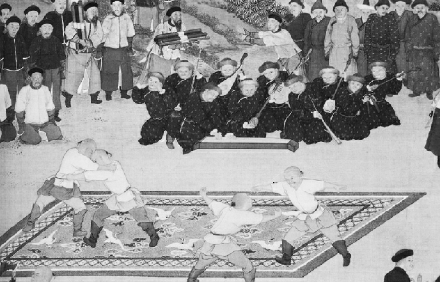 到清代,角抵开始与满族民俗相交融,并被称为“布库”。由于宫廷支持,这项运动又逐渐走向新高潮。“善扑营”称为当时清廷专门管理角抵的机构,同时也出现了专职的“布库手”,其单以角抵为职,研究和练习摔跤。这在清代画家郎世宁创作的《塞宴四事图》中即有描绘。每年腊月二十三日,其会在养心殿前举行比赛。按画中所示,参与比赛的四人两两对抗,气氛紧张。