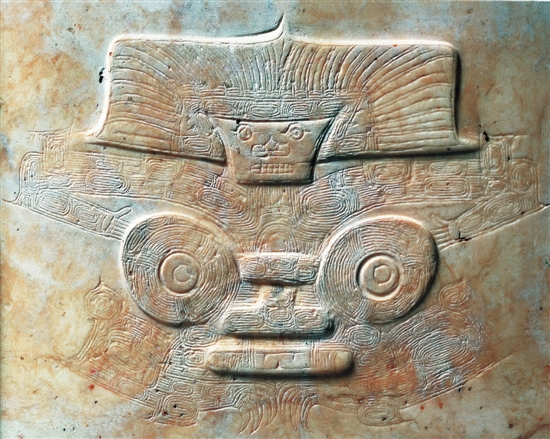 1986年浙江省杭州市余杭区瓶窑镇反山遗址M15出土 玉冠状器为良渚文化时期带有礼仪性质的装饰玉器。该器物平面整体呈宝盖头结构,如同良渚文化晚期的台阶形玉片的结构,冠顶中部切割呈宝盖头结构,下端扁榫上有三个等距的对钻小孔。正反两面以透雕和阴线刻划相结合的技法,对称雕琢肢体俱全的神人图像,填刻光芒线的宝盖头冠帽,倒梯形脸部,单圈眼,一侧刻划眼角,刻划有牙齿的宽嘴。神人上臂两侧各“持”有鸟形象,此部位纹饰或可视为兽面纹的双眼,神人胸腹部位为一般常见的圆拱形结构。两面的纹饰除个别刻划线条的结构有区别外,余均一致。