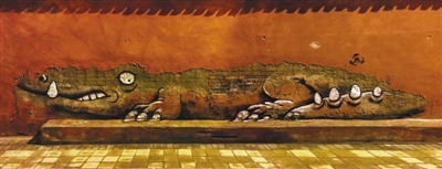 齐兴华利用破损墙面的走势画了条鳄鱼,不久即被破坏,依旧露出丑陋的墙面。