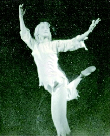 《敌后交通员》就是我学习编导后编排的第一个小舞剧了。它取材于当时一部流行的电影《鸡毛信》,故事讲述的是一个村姑——敌后交通员,送鸡毛信给八路军,为了安全起见,她女扮男装,变成一个放羊娃,顺利送信的故事。除了编导,我还演这个敌后交通员,因为是女扮男装嘛,有很多如“旋子”、“侧空翻”等男孩子做的高难度动作,我都需要去做。这对于我是有一定难度的,然而,我那一股不服输的劲头告诉我,我必须克服它,于是,我就去舞校找来老师教,自己下功夫练,再加上自己本身也有戏曲的功底,很快便克服了。