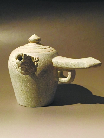 在鞠肖男收藏的茶器中,以唐宋居多,其中有一套唐朝的随葬茶器是他最为看重的。唐代茶器存世很少,这套唐代孔雀石茶器的难得之处,不仅在于它十分完整精致,由茶台、茶碾、水壶、煮茶器、茶壶和四个茶杯组成,真实地反映了当时人们饮茶的方式:先将制成的茶饼敲成小块碾碎,将水壶中的水倒入煮茶器烧至将沸时倒入茶末,煮开之后倒入茶壶,再倒入茶杯。