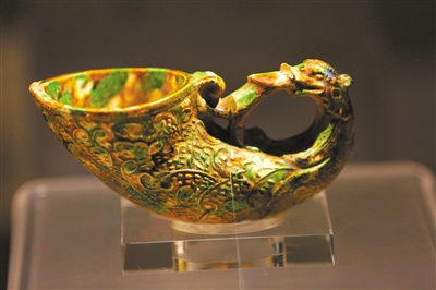 唐《三彩牛角形孔雀杯》。(河南博物院)