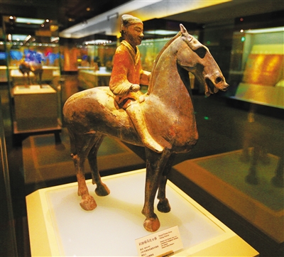 西汉彩绘骑马武士俑。(陕西博物馆)