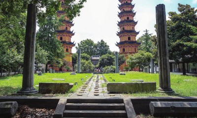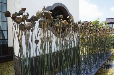 苏州城东南角定慧寺巷内的双塔下,砖草掩映着北宋罗汉院的废墟遗址。在这里,人们将与艺术家吕美立和王谦的作品 《有无》 相逢。这是分3列排开的数十只陶盘,用从苏州各个地方搜集而来的泥土混合烧制成,盛放在其中的是苏州各个水域的水。它们似乎是确凿的存在,然而随着时间的推移,陶盘以及盘中的水都在发生着微妙的变化,水会挥发、流动,陶盘也会受到风化、侵蚀。遥远的以后,它们或许都将化为一抔尘土、一片荒草,这让人不禁联想起脚下北宋罗汉院的命运。老子云“天下万物生于有,有生于无”,当今艺术家们的创作与有着千年历史的双塔彼此观照,述说着新与旧、有与无的相互转化。
