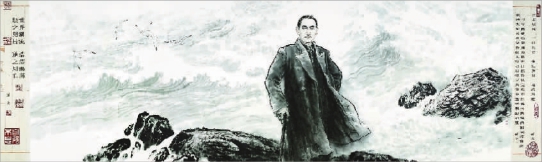 长卷的最后一张《矗立潮头——世界潮流浩浩荡荡》描绘岿然站立在惊涛骇浪边的孙中山,展翅于海面上的五只海鸥与涌动的海潮使画面生发出蓬勃的生命感与运动感,既与主体人物形成疏密对比,又使作品格调借由人物形象的探索与历史思想的钩沉熔铸于笔端。