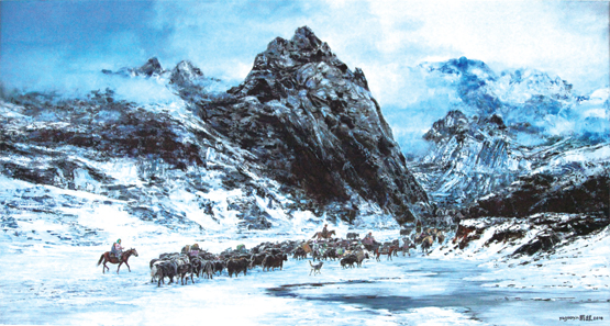 如果说蔚国银的肖像画、人体画、静物画是属于写实风格,那么他的风景画无疑属于写意风格。《春到陇原》以带有表现意味的笔法刻画西北高原大地,重点描绘陇原风光的结构感与坚实感,给人以雄强、阳刚的艺术美感;《陇原冬雪》《过年》给观者以雄伟、苍茫、浑厚、广阔、无垠的意境,刀与笔的合力形成了充满力度的大气磅礴之势;《老子出关》描画老子骑牛穿行于云山雾气之间,充满东方意趣,此画将中国山水画的意境、韵味挪用到油画创作之中,油画的笔触、肌理、质感与中国画的用笔、皴法、阴阳相互融会,其用笔劲爽、奔放,其中的开合、虚实、远近、疾缓与中国的山水画如出一辙,凸现了艺术家打通中西、吞吐古今的艺术理念;《迁徙》是一幅160×300cm的鸿篇巨制,天空云雾弥漫,高山崇峻屹立,风雪、云气萦绕其中,给人以险峻、崇高、壮丽的美感,其用笔浑深坚伟,意境邈远升腾,无论在经营位置还是在骨法用笔上都借鉴了中国画的表现方法,尤其是巍峨高耸的群山之下那一群渺小的迁徙马队与牛群,符合中国画“丈山尺树、寸马豆人”的审美规范。