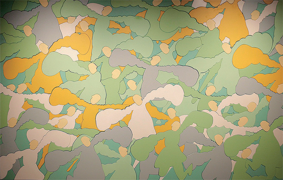 王艺的壁画巧妙结合了传统和现代元素。中国国家画院“丝绸之路”艺术考察的所见所闻,中国传统绘画中的“没骨”笔法,无不给予其丰富的创作灵感。如《游春图》色彩浓丽明快、丰富而和谐,用线和造型颇具写意人物画特有的谐趣。绘画语言上整合了民间绘画的勾线平涂法和敦煌壁画中的勾勒形式,以连续的图案交叠拼排。纯色之间的相互映照、补色对比形成的张力,使得画面生发出繁茂古朴、新鲜活泼的趣味。《礼乐图》画面中人物纷杂、长袖善舞,虽无面部表情,但身体的姿态呈现出和谐与放松,极具装饰效果。这一系列作品有着浓厚的哲学思辨意味,既有对东方平面化审美传统的含蓄因循,又有作者一贯的诗意化放纵,在其艺术创作中保持着一种语言层面的递进关系。