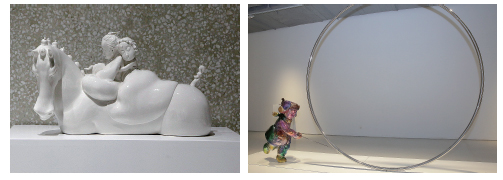 此次参展的雕塑作品包括古代人物和现代人物两类。其中古代人物主要以“点绛唇”、“念奴娇”等词牌命名,此外还有“酬酒花间”、“桃园三结义”等。这些姿态各异的人物神情富于传统之美,但也偶有小狡黠、小趣味。现代人物则大多呈现了王艺对当下人性和社会的内在体验。无论中国文人情怀的表达,还是现实人物的日常情境,都体现出艺术家多形态的雕塑语言尝试。