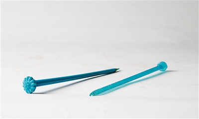 这两支发簪是丁英俊分别在扬州和苏州收得,出自宋元时期。《宋史·五行志》曾记载:“绍熙元年(1190),里巷妇人以琉璃为首饰。”由此可见南宋末期,琉璃首饰风靡一时。宋元时期,琉璃在苏杭一带颇为盛行。据了解,琉璃的发展与“仿玉”的企图有密切关系。从战国、汉代、六朝时期出土的料壁等就能看出模仿玉器造型花纹的企图,不透明的外表也是在追求玉的质感。宋代人称琉璃又为“药玉”,元人则称之为“瓘玉”,都有“烧造成的玉器”之意。