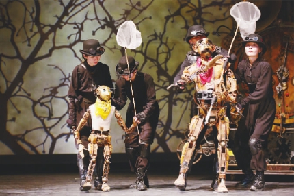 于是就有了马良带领一个团队耗时两年多打造出来的奇幻装置舞台剧《爸爸的时光机》 ,该作品作为第十八届中国上海国际艺术节的委约作品,日前登陆上海上剧场。这部跨界融合了装置、木偶、皮影、动画等多种元素的作品,用鲜有的表现形式讲述父子亲情:年老的父亲开始遗忘很多事情,也不认识儿子了,所以儿子制造了一台时光机,帮父亲回忆往事,试图唤起他的记忆。这是马良献给父亲的礼物,整部作品传递出浪漫、温暖又忧伤的抒情气息。用超过1500个零件组装成的蒸汽朋克风格的4个木偶是剧中的主人公,通过演员的操作,木偶们奇迹般地有了生命力。这部作品还未创作完成时,就被多个国际艺术节邀约。