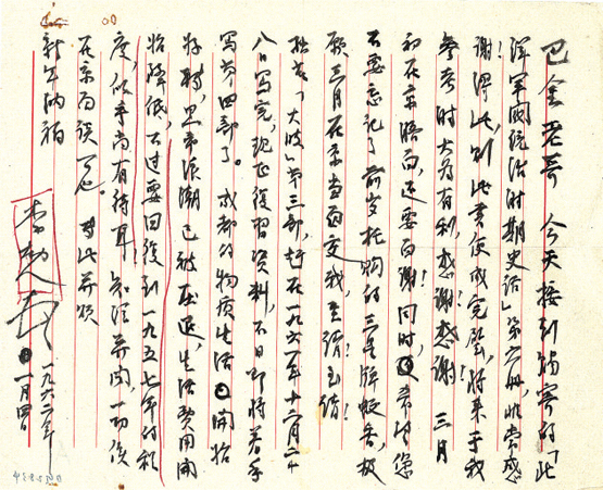 时间转眼就过去了三年多,李劼人和巴金的友谊不断,除每年开春在北京开会的见面外,平时更有不少书信往来,此信中巴金寄去的“《北洋军阀统治时期史话》第六册”,李劼人大为感谢,称此书“将来于我参考时大为有利”,体现出李劼人重视史料,是在以史为据的前提下,再铺陈故事、刻画人物的写作特点。