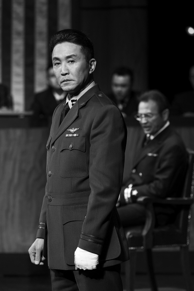剧场里,开场钟早已敲过三遍,格林渥穿着硬朗帅气的军人制服站在舞台上,发丝根根锃亮,两侧剃得极短,带着乌青。他巧舌如簧,质疑着每一个企图为原告作证的人,他是被告的律师,却以狡黠的诡辩取得了最终胜利;而走出法庭后,他才说出了潜藏内心的真实想法。