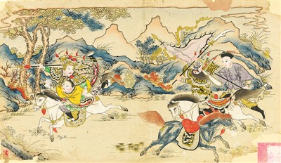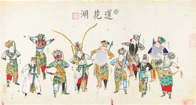 此外,还有一些作品属于年画画师“点套”的粉本,即印出墨线版后,画师直接在上面手工填色,刻工再据此分别刻出各块色版。这类粉本过去在年画作坊内秘而不传,今朝得见,也是非常难得。这次展览中的《雅观楼》《逍遥津》《雁门摘印》《捉放曹》《年年太平》等,就属于粉本中的精品。