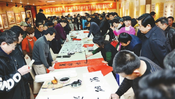 像这样的活动,山东省书协每年都会为基层单位的书法爱好者开展一讲(一场讲座) 、一评(现场点评) 、一示范(书写示范)活动。为更好地扶持基层书协进行书法文化的普及、教育与教学,从2013年开始,省书协自筹资金,为全省17地市书协发放每年一万元的专项经费,以此推动“百县千村”书法下乡活动的开展。