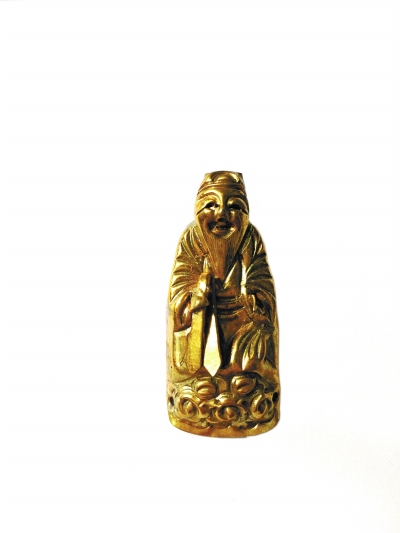 在“嘉树堂”里,有一类金属器物看似不起眼儿,但做工很考究,最小的只有指尖大小,也被他戏称为“小人物”。贾树介绍说,“小人物”可不简单,人物是立体的,制作工序不比大的佛造像省事。工匠先把熔炼出来的铜块,用小锤反复敲打制成铜皮薄片,再将铜片放在一个制作好的模具上,继续敲打成形,人物的脸部、身体、衣服的花纹都要通过精细的錾刻、鎏金工艺,成品栩栩如生,每根胡须都能看得分明真切。“小人物”可分为纯铜、铜鎏金、银鎏金、纯银制作,材质不同,大小各异。