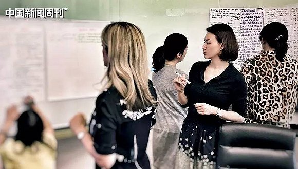 董卿(右二)和《朗读者》节目团队开会。图|受访者提供