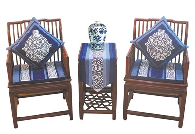 他是这么说的,更是这么做的。他把传统的小布印染发展为宽布印染,把单调的蓝白两色创新到深浅蓝复色,把原始棉麻面料拓展到丝绸面料,创作出大量兼具传统与新意的纹样,制成兼具实用性和审美性的衣服、桌布、抱枕等,与更多人分享蓝白之美。每当他的努力得到实践的认可,父亲都会咧开嘴笑成孩子模样。
