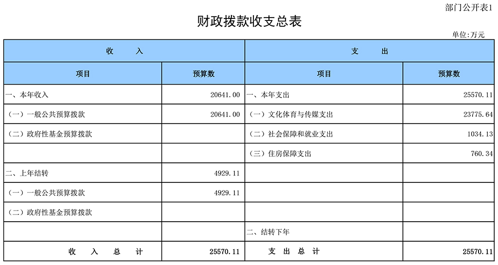 收入包括:一般公共预算拨款20641万元,上年结转 4929.11万元。支出包括:文化体育与传媒支出23775.64万元,社会保障和就业支出1034.13万元,住房保障支出760.34万元。