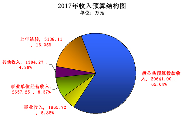 电竞竞猜官网2017年收入预算31736.35万元,其中:上年结转5188.11万元,占比16.35%,一般公共预算拨款收入20641万元,占比65.04%,事业收入1865.72万元,占比5.88%,事业单位经营收入2657.25万元,占比8.37%,其他收入1384.27万元,占比4.36%。