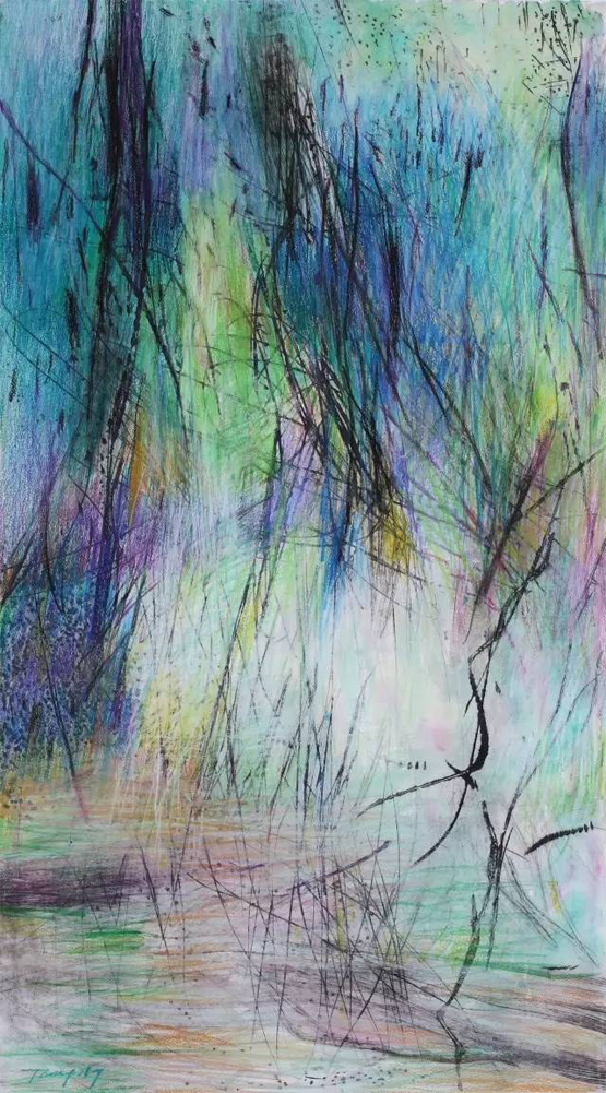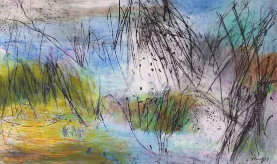 “行走的风景”系列作品以景色为主,色彩绚丽,虽寥寥数笔,但生机却扑面而来。站在他的作品面前,睁开眼睛,是四面笼罩而来的汹涌生命;闭上眼睛,则是交织纵横的眩晕风景。这支画笔是任性的、挥洒的,却又是含蓄的、思索的、耐人捉摸的。吸引电竞竞猜去捉摸的,不仅仅是如云色彩的铺陈和乐章般的点线跳跃,因为电竞竞猜仿佛看到了风景,却又希望看到风景背后的离奇。