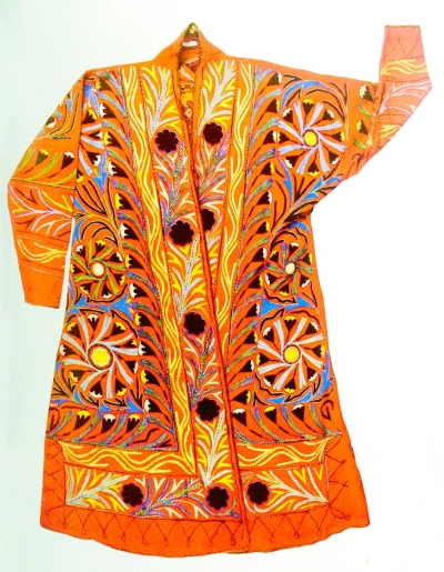 及至明清时期,西域民族纺织也有了很大的发展,棉毛麻的织造技术提高,大量绸缎、毛织物、鹿皮、牛皮、棉麻与刺绣结合,绣线选择尚金崇艳,配色讲究撞色醒目。如1963年从故宫博物院调拨,藏于新疆博物馆的明代的“洒线绣云龙袍料”,其绣地为明黄缎面,绣有云纹与龙纹,龙头上下分别绣有葫芦、花盖、火轮纹饰;同样从故宫博物院调拨,藏于新疆博物馆的清代的“哈萨克族鹿皮袷袢”,绣地选择为鹿皮,鞣革细腻,在袷袢的前襟、领口、袖口处,用白、蓝、红、绿等绣线绣有花草叶组合的纹样,色泽鲜艳;另藏有清代的“维吾尔族毛织袷袢”,绣地是羊毛织物,质地浑厚柔软,刺绣采毛线,仍以花草茎叶纹饰为主,袷袢的领边、袖口与前襟绣满花纹,配色鲜艳;再有新疆博物馆藏的清代哈密“维吾尔族桃红地绣花女式袷袢”,绣地为缎,内衬为粉底花棉布,衣襟与袖口绣满牡丹、花草树叶纹样;新疆博物馆藏的清代“哈萨克族鹿皮绣花男裤”,绣地为鹿皮缝制,皮面上用红、蓝、白、金等各色线绣有团花纹样、花草纹样以及哈萨克族独有的角形图案;新疆博物馆藏的哈密王帽,绣地采用橘黄色丝绸,帽顶与帽檐四周绣有巴旦木、石榴与花草枝叶,帽顶中心挂有璎珞,穗带垂及帽檐底部。清代西域也出现了大量绣地为牛皮的维吾尔族绣花高跟女鞋、绣花长筒皮靴等。